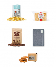 Topped off with the included customized box and a personalized card, the recipient can't help but feel special. Product Option: Regular: POPPY HANDCRAFTED POPCORN Poppy Mix Popcorn; BYRD'S COOKIE COMPANY Classic Rice Crispy Treat; GIDDY UP NUTS Coffee Chocolate Almonds; MARTIN'S HANDMADE PRETZELS Original Pretzels; Libretto Journal