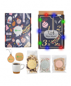 Give your recipients an all-out holiday gifting experience with an advent calendar-style reveal, colorful lights, & festive music. Kit includes: Sir Walter Rocky Road Popcorn (6 oz), Sir Walter Cashew Brittle (2 oz), Sir Walter White Chocolate Covered Christmas Tree Pretzels (2 oz), a customizable Ceramic Mug with Removable Bamboo Coaster, & a festive Wooden Bulb Ornament. Box includes multi-colored lights, an advent calendar-style insert, & a sound chip that plays "Deck The Halls.". Complies with FDA, Prop 65. 11.5" W x 9" L x 3" H