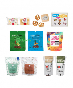 NOT IMPRINTED. Features: 2 Martin's Handmade Pretzels' Original Pretzels, 2 ea Byrd's Cookie Company Cupcake Rice Crispy Treat & Original Rice Crispy Treat, Poppy Handcrafted Popcorn in Everything Bagel & Parmesan Black Pepper Popcorn, Fusion Jerky in Island Teriyaki & Chipotle Lime Jerky, Little Apple Treats in Apple Cider Candy Cap Caramels & Apple Cider Espresso Cocoa Nib Caramels, 2 Legally Addictive Surprise Party, & a 6-pack of snack personality pins. Complies with Prop 65. 14" W x 7" H x 14" D